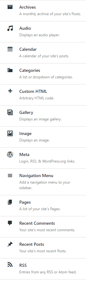 - Widgets. Optional. These are different tools you can place throughout your website such as archives, calendars, search bars, and more. Completely optional, but can be helpful depending on what website you have.